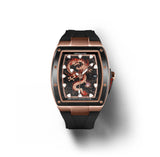 Black. A dragon-shaped metal appliqué in the center of the dial.Skeleton metal hour and minute hands filled with luminous