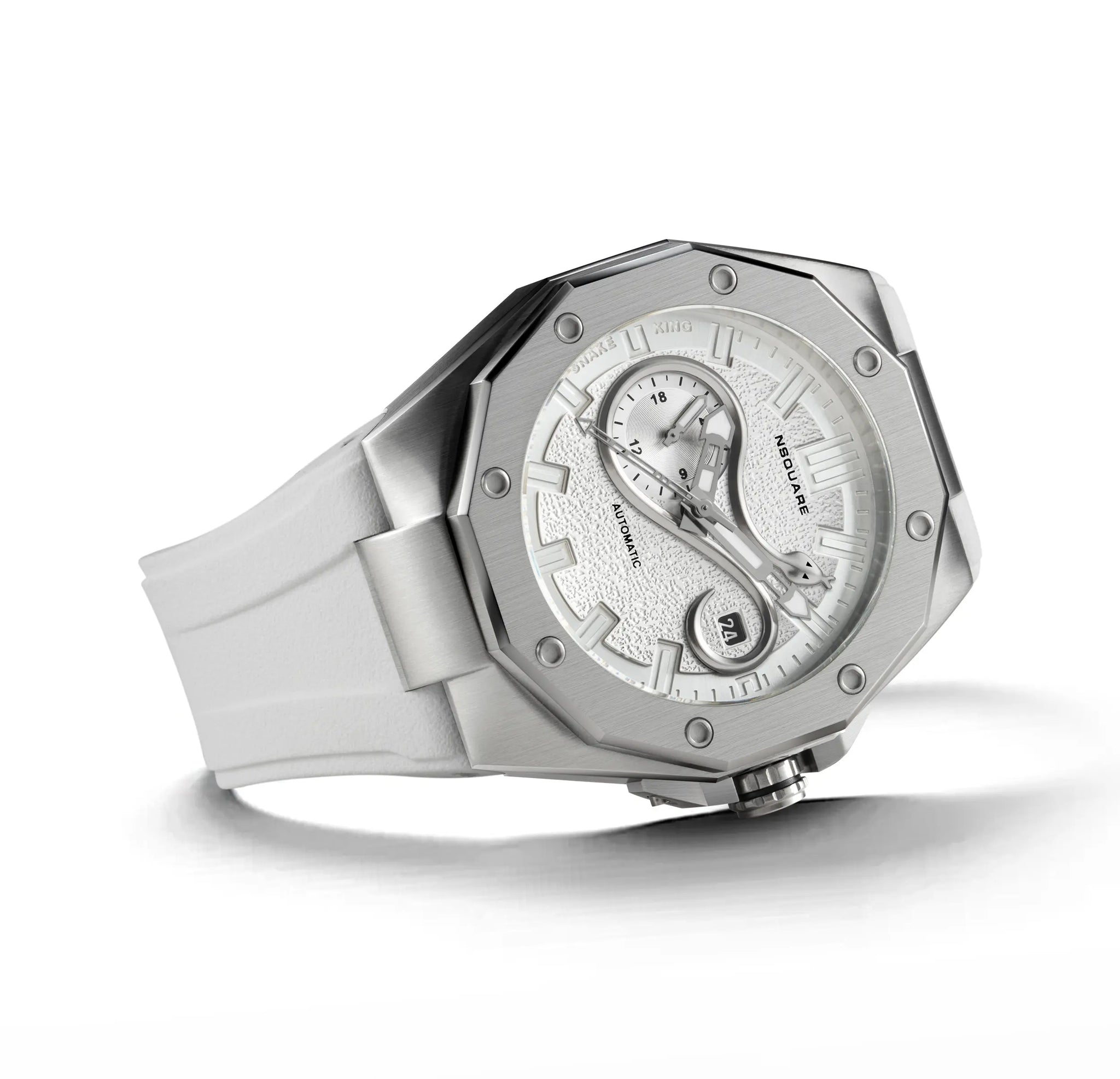The NSquare SnakeKing Lunar Silver is a bold reinterpretation of exquisite craftsmanship and innovative design, created for those who seek individuality and superior performance. As the silver serpent coils around your wrist, every passing moment is a tribute to transformation and excellence.