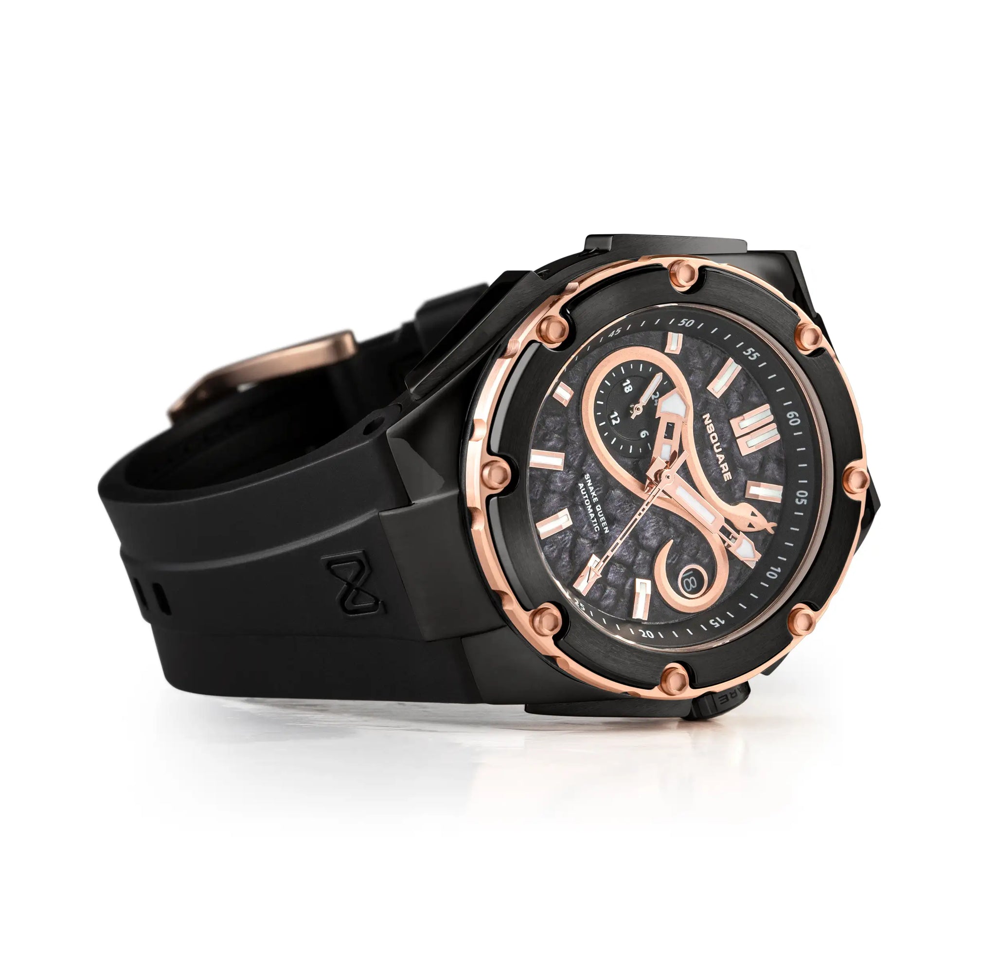Case: 39mm in Diameter. Black/Rose Gold PVD Coated Stainless Steel 316L. Back with Opening in the Specially Hardened Mineral Glass with Anti-reflective Coating, Centered on the Balance. Black Stainless Steel 316L Crown