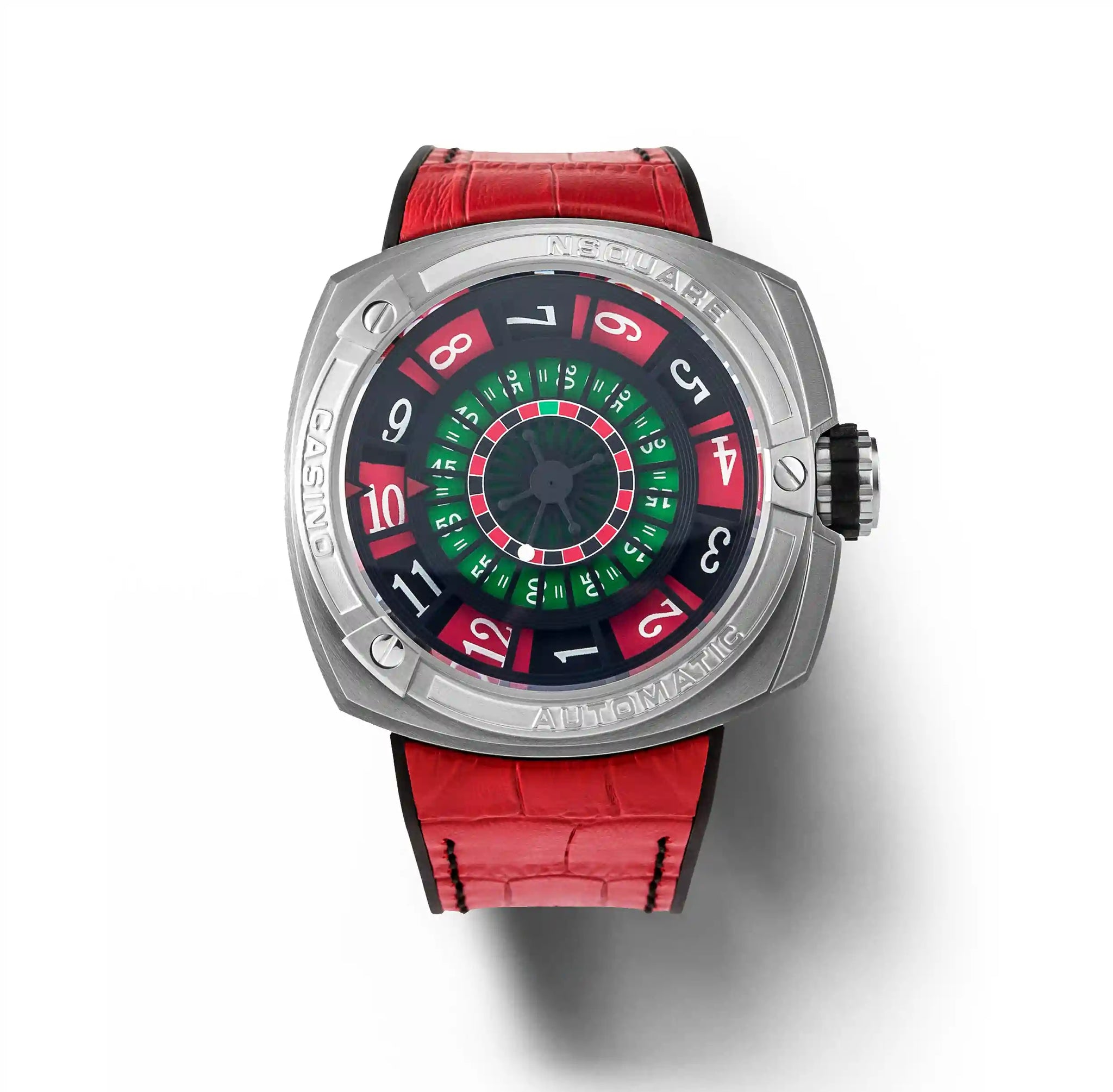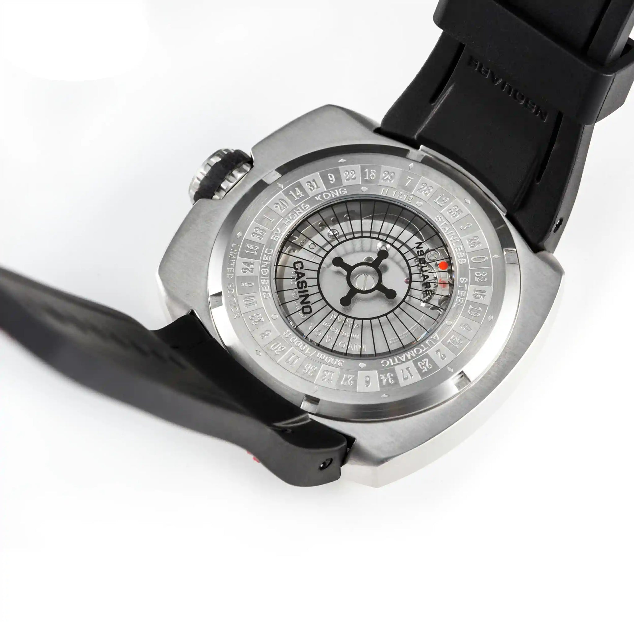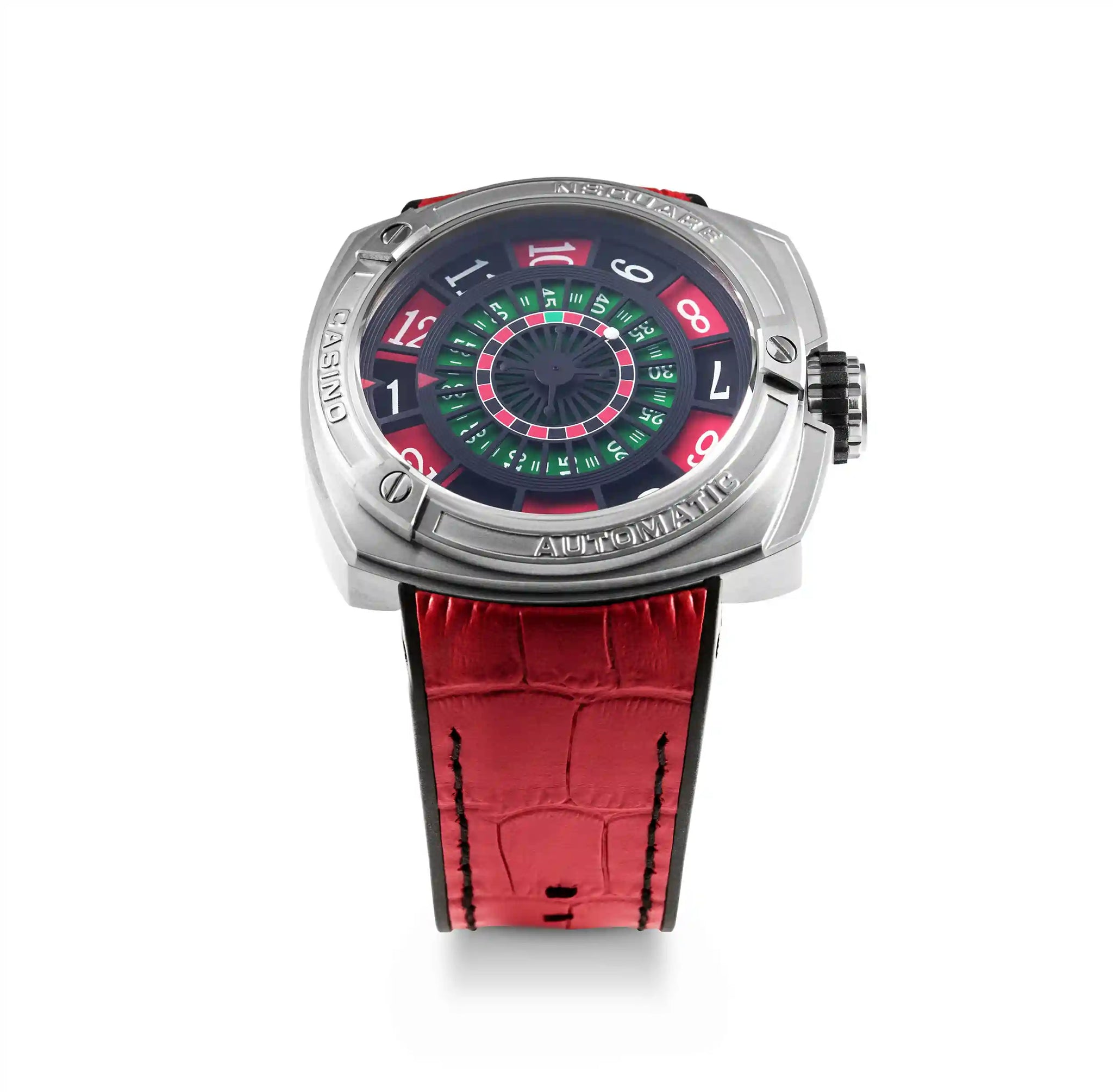 錶帶:雙材質:紅色鱷魚皮紋皮革,黑色橡膠。