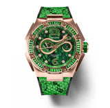錶盤:春綠色蟒蛇紋錶盤。白色施華洛世奇水晶索引。帶有白色字的黑色日曆。玫瑰金 PVD ​​時針、分針和秒針。 12 點鐘位置印有徽標。