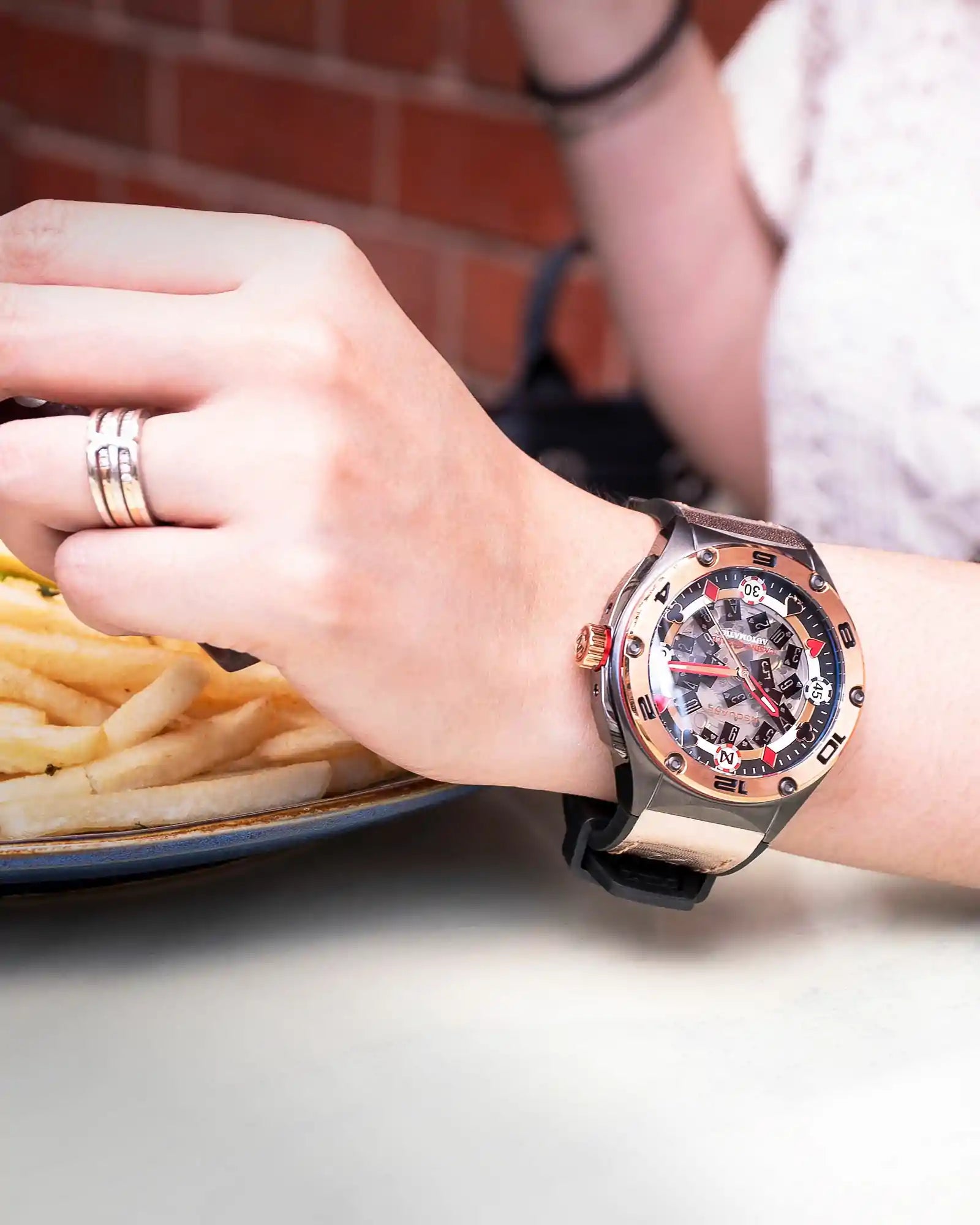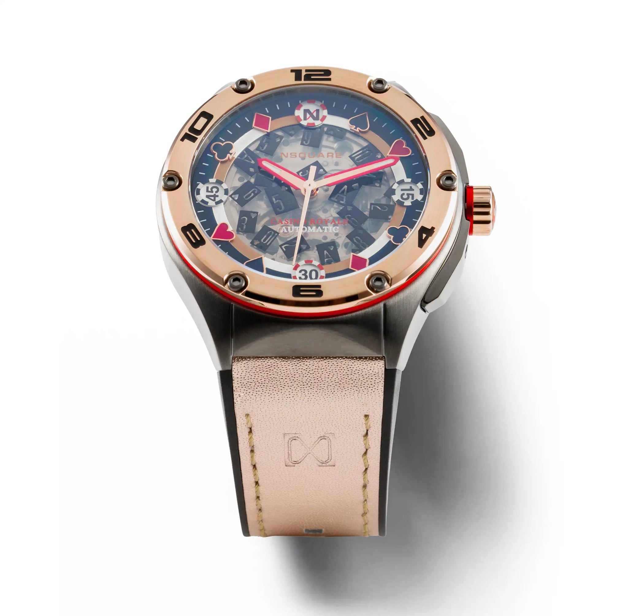 錶殼:直徑 45 毫米。不銹鋼 316L 槍金屬 PVD 與玫瑰金 PVD 表圈。帶有紅色細節的槍色金屬表冠。槍色 PVD 表圈帶 6 顆螺絲。藍寶石水晶。
